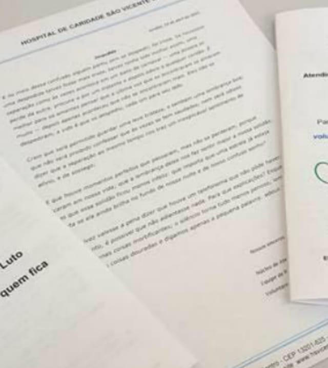 Vivenciar o luto e se adaptar à ausência de quem partiu pode ser um processo muito doloroso, podendo resultar em reações físicas e mentais. Pensando nisso, a equipe de psicologia do Hospital de Caridade São Vicente de Paulo (HSV), em parceria com o grupo voluntário “Visita Vicente”, vai iniciar na próxima semana um projeto de amparo psicológico aos parentes que perderam seus entes queridos.