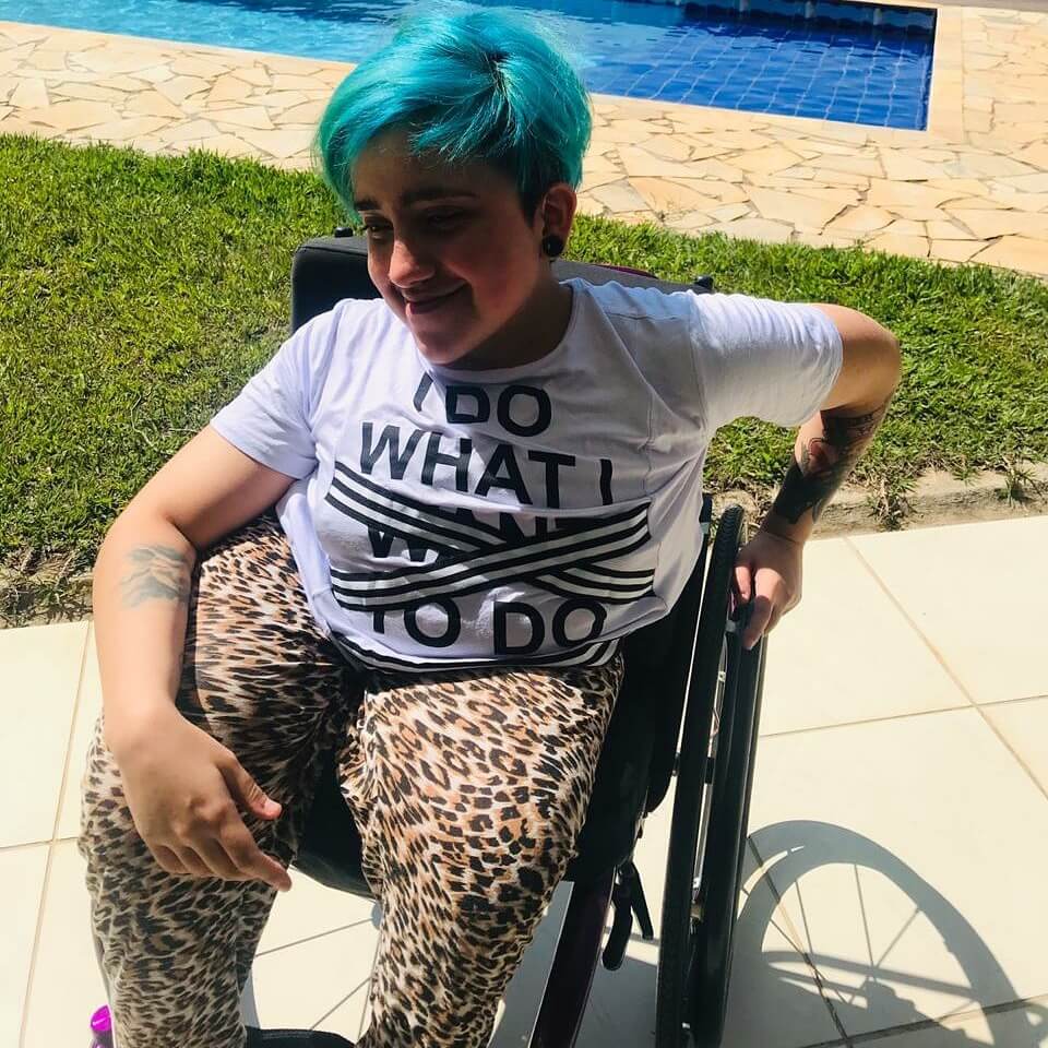 “Meu dia a dia é bem ameno, tenho estado mais em casa ultimamente e mal saio. Confesso também que pode ter a ver com a insegurança que tenho na cadeira de rodas hoje em dia. As ruas/calçadas já não dão suporte, estar numa cadeira que não é adequada é ainda pior.”