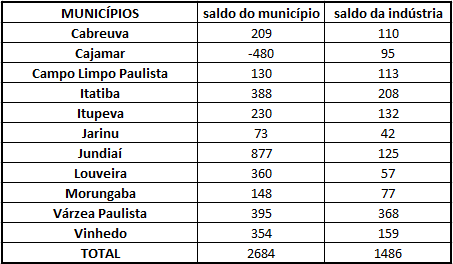 As cidades que compõem a regional do CIESP Jundiaí são: Jundiaí, Itatiba, Itupeva, Cabreúva, Cajamar, Campo Limpo Paulista, Morungaba, Jarinu, Louveira, Várzea Paulista e Vinhedo. O saldo de empregos gerados dos municípios foi positivo, totalizando 2.684 novos postos de trabalho, de acordo com a tabela a seguir.