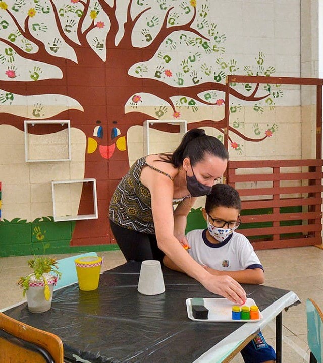 Desfrutando dos espaços externos da escola e explorando a imaginação para descobrir novas produções de atividades diversificadas, toda a ação engloba o desemparedamento da Escola Inovadora. “Nós produzimos algumas estações de atividades preparatórias para a nossa apresentação, encerramento de projeto. Os alunos pintaram uma aquarela, que serviu de painel de fundo para as fotos no dia do evento, fizemos também uma colagem com o tema de coração floral que as crianças adoraram”, contou Juliana Marcela Gomes, professora do G4 A.