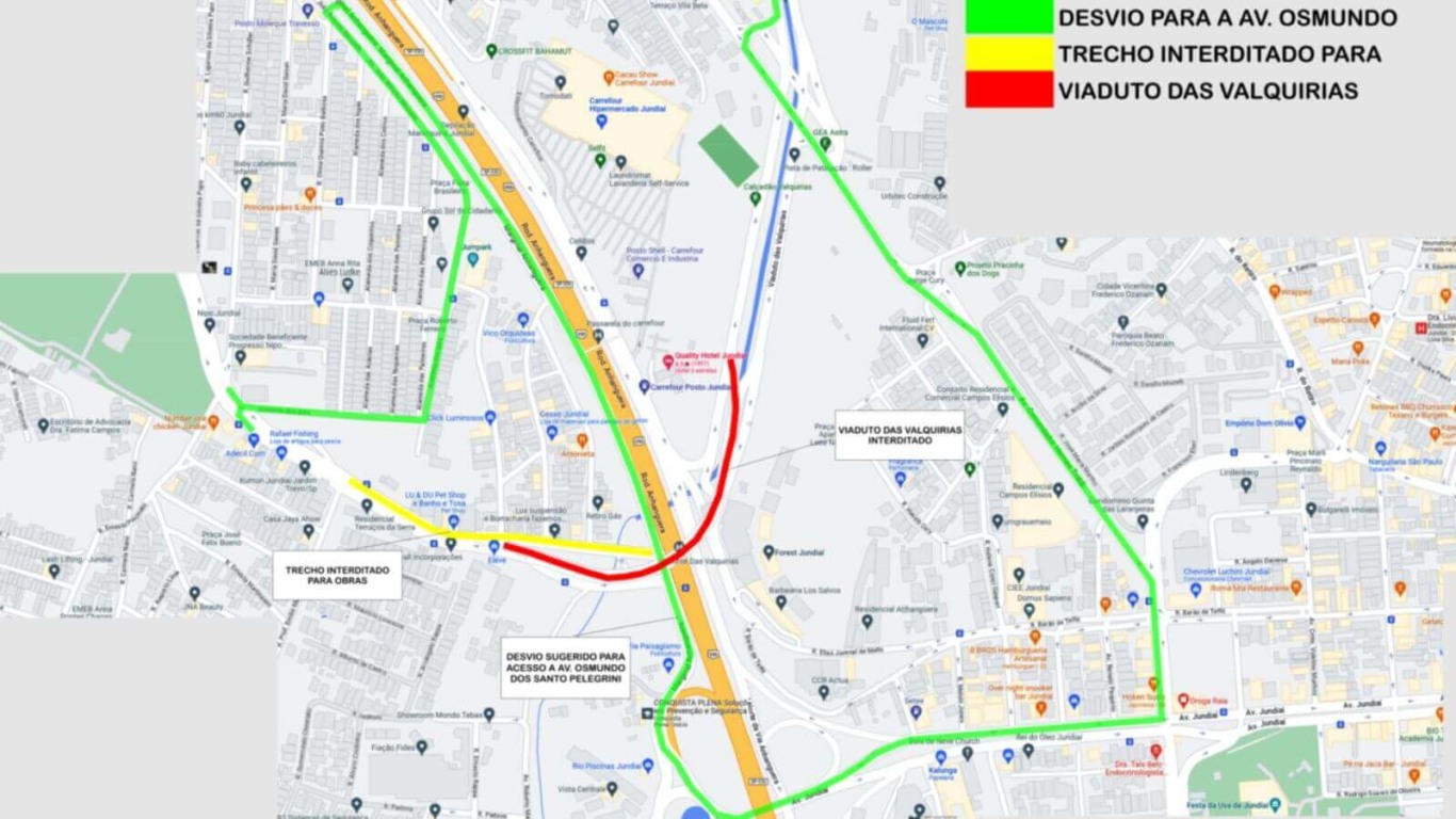 No mapa, a linha amarela indica o trecho da interdição na Av. Osmundo dos Santos Pellegrini; a linha vermelha indica interdição do Viaduto das Valquírias. Já a linha verde indica sobre os desvios opcionais para os condutores de veículos.