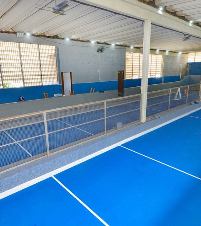 Também foram finalizados os serviços referentes à instalação das madeiras de acabamento nas cabeceiras, pintura de alvenaria interna das pistas e instalação dos carpetes nas laterais e cabeceira das canchas.
