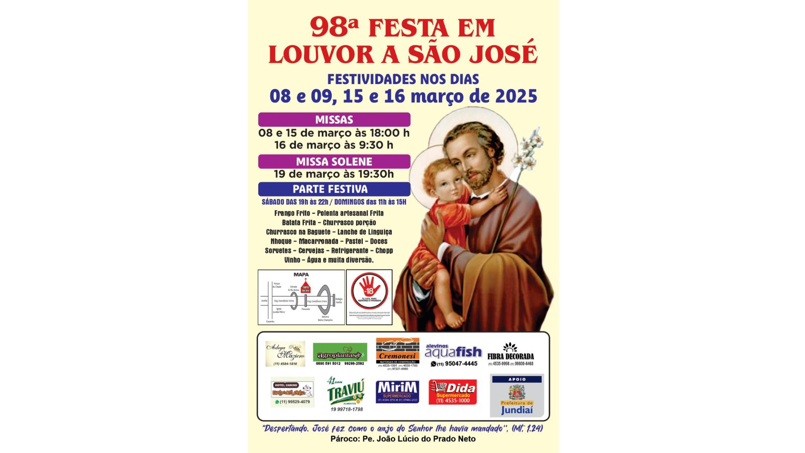 A tradicional Festa em Louvor a São José chega a sua 98ª edição em Jundiaí (SP). A festividade será realizada nos finais de semana, 8, 9, 15 e 16 de março, no Salão da Capela, que fica na Rodovia Engenheiro Constâncio Cintra, Km 72, no bairro Mato Dentro.