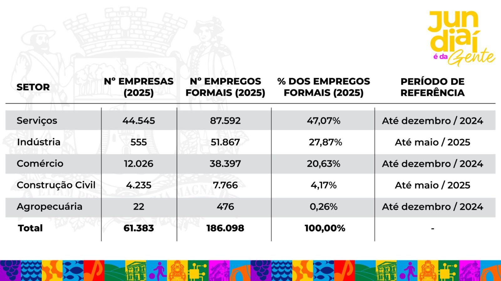 Ao todo, Jundiaí soma 61.383 empresas em operação, responsáveis por 186.098 empregos formais, distribuídos entre os setores de serviços, indústria, comércio, construção civil e agropecuária. Apenas entre 1º de janeiro e 15 de maio de 2025, o município registrou a abertura de 898 novas empresas — um indicativo claro do ambiente propício ao empreendedorismo e à expansão dos negócios.