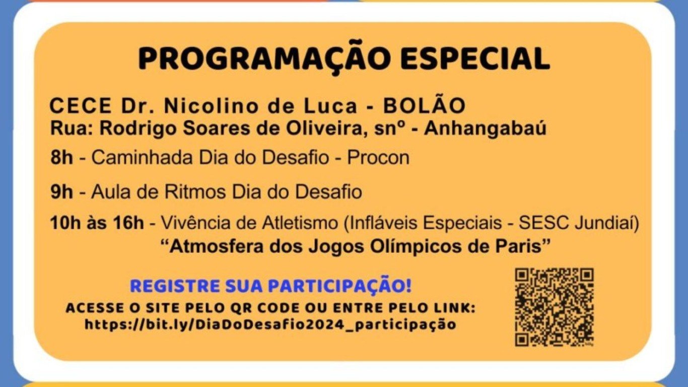 Em Jundiaí, as atividades do Dia do Desafio acontecerão no Complexo Esportivo do Bolão, com início às 8h da manhã. A programação inclui: