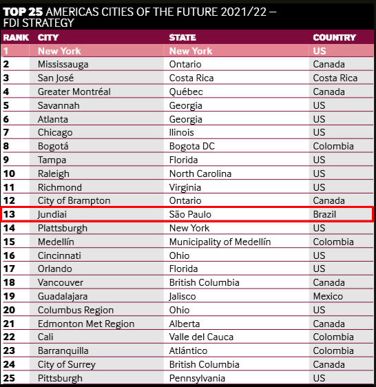 Mais uma conquista para colocar na conta: Jundiaí foi incluída no ranking da 6° edição do “Cidades do Futuro” pela FDI Intelligence. A pesquisa compreende todas as cidades, de pequeno, médio e grande porte de todas as Américas, avaliando-as em cinco categorias: Potencial Econômico, Amigo dos Negócios, Capital Humano e Estilo de Vida, Custo-Eficácia e Conectividade.