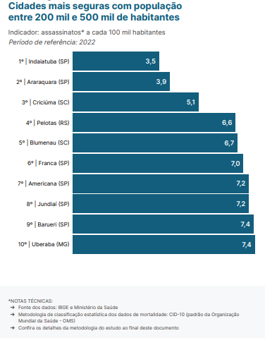 Confira o gráfico das cidades mais seguras do Brasil com população entre 200 mil e 500 mil de habitantes: