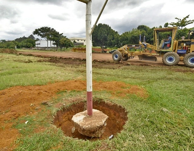 O local também recebeu a concretagem das vigas de baldrame (elementos estruturais que dividem a fundação das estruturas acima do solo) e a fixação dos mourões, que são as vigas de concreto que sustentam o alambrado.