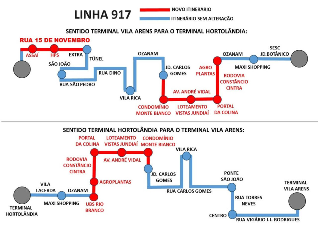 A partir de quarta-feira (20), Jundiaí realizará adequações no itinerário da linha 917 (Terminal Vila Arens/Terminal Hortolândia via Ponte São João e Jardim Carlos Gomes). Assim, a linha de ônibus passa a atender o Loteamento Vistas Jundiaí – composto pelo Residencial Panorama, Cenário e Mirante – em ambos os sentidos. Além disso, a mudança beneficia os condomínios Monte Bianco e Portal da Colina.
