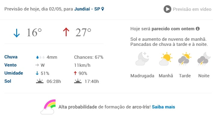 Com mínima de 16ºC e máxima de 27ºC, com ventos de 11km/h, ainda de acordo com a previsão do portal meteorológico Climatempo.