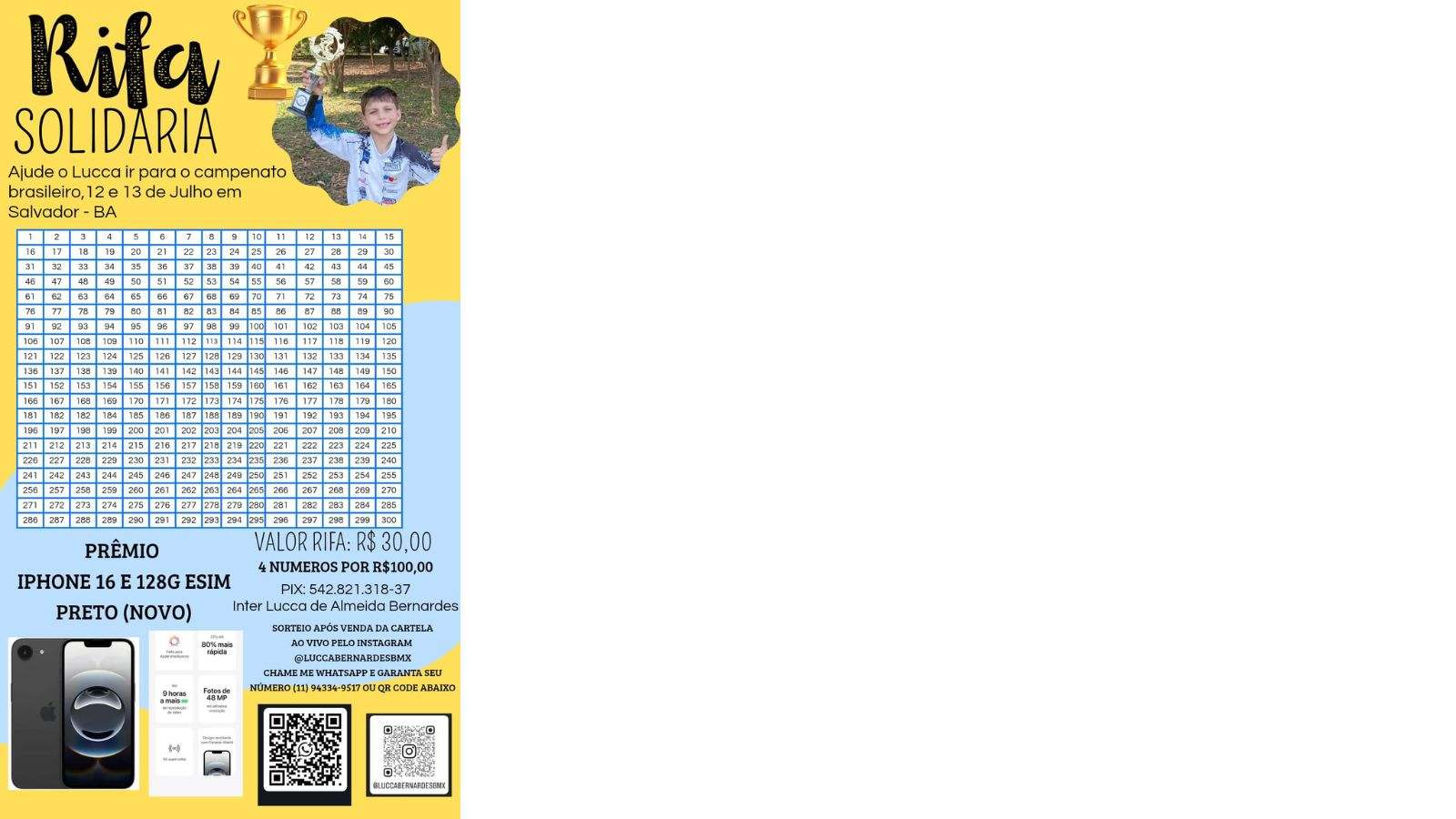 Para arrecadar os recursos necessários à viagem, a família de Lucca organizou uma rifa solidária. O prêmio é um iPhone 16e de 128GB, na cor preta (produto novo). Cada número custa R$ 30, mas quem adquirir quatro paga apenas R$ 100.
