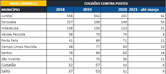 Para a campanha do Maio Amarelo, a CPFL realizou um levantamento e, no ranking de cidades com mais registros de queda de postes, Jundiaí está em primeiro lugar. No total, a companhia de distribuição de energia elétrica registrou 1.286 colisões de veículos contra postes em todas as cidades de atuação em 2020.