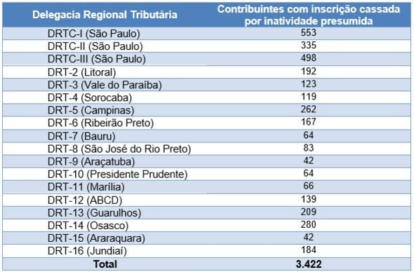 A Secretaria da Fazenda publicou no Diário Oficial do Estado, neste sábado, a cassação da inscrição estadual de 3.422 contribuintes paulistas do Imposto sobre a Circulação de Mercadorias e Serviços (ICMS) por inatividade presumida, e nas cidades da região de Jundiaí foram 184.