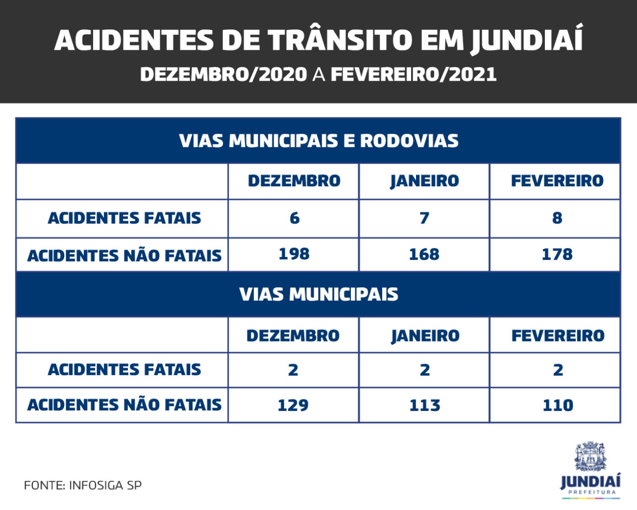 Tabela com dados sobre acidentes de trânsito em Jundiaí (Foto: Divulgação – Prefeitura de Jundiaí)