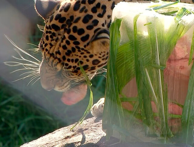 Esse sorvete é produzido especialmente para os animais, com uma mistura de água, capim e carne, que agrada os felinos, principalmente os mais velhos. Diferentemente dos filhotes, eles se interessam mais pelo alimento de dentro do cubo de gelo.
