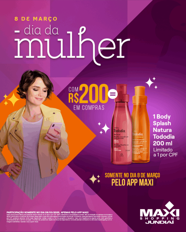 Ao realizar compras no valor de R$ 200 ou mais, no dia 8 de março, a cliente ganha um Body Splash Natura Tododia de 200ml. Para aproveitar esta promoção, basta juntar as notas fiscais de compras realizadas nas lojas participantes e cadastrar os comprovantes pelo aplicativo Maxi. Em seguida, é só retirar o presente no Balcão de Trocas, localizado no Piso 1 do Shopping (próximo à Entrada do Sol).
