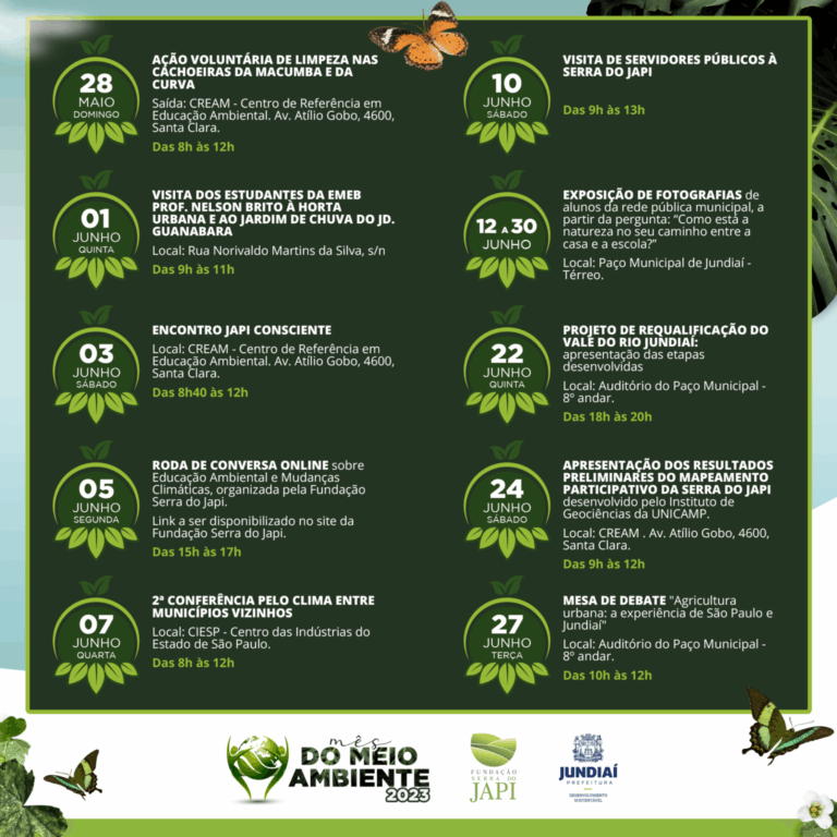 “A programação do mês do Meio Ambiente traz várias oportunidade de aproximação das pessoas para entender a complexidade e a importância da preservação ambiental, não só da área da Serra do Japi e do ambiente mais próximo de onde a gente vive, mas de ambientes mais distantes também. Passando pela questão da Educação Ambiental, do empreendedorismo com sustentabilidade e da importância da pesquisa, com a participação da sociedade civil”, lembra a superintendente da Fundação Serra do Japi, Vânia Plaza Nunes.