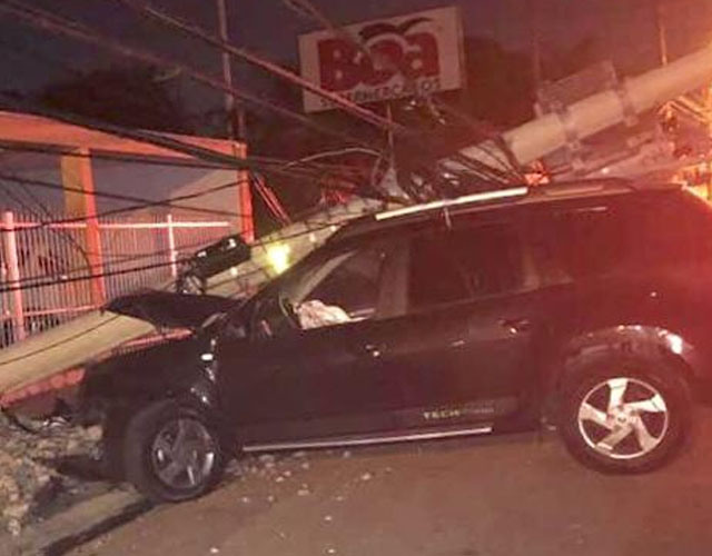 O impacto foi tão violento que o equipamento de iluminação pública quebrou ao meio e caiu uma parte em cima do carro.