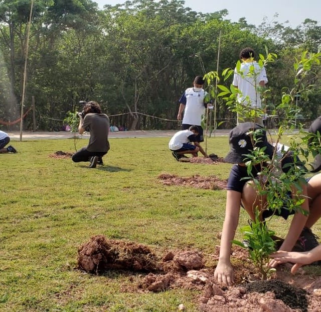 62 alunos da EMEB Aparecido Garcia, do Jardim Martins, levados pela Unidade de Gestão e Educação (UGE) visitaram o Mundo das Crianças, para celebrar o Dia da Árvore, comemorado nesta terça (21), fizeram o plantio de 44 mudas de árvores nativas e frutíferas no Espaço Paca, em frente aos escorregadores.
