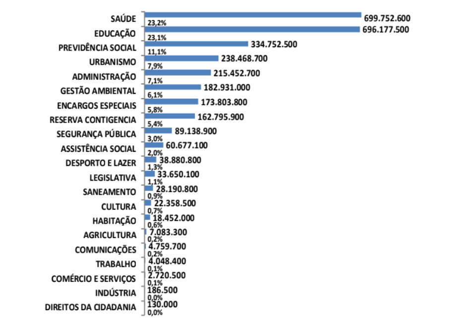 A Saúde e a Educação são detentoras da maior parte do orçamento, com 23% do orçamento cada, o que representa cerca de R$ 700 milhões para cada área. Confira o investimento projetado para cada área:
