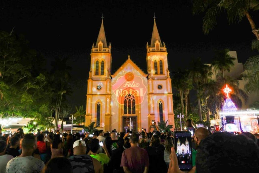 Com repertório misto de clássicos natalinos, musicais famosos e canções nacionais, as janelas do Museu Histórico e Cultural – Solar do Barão foram palco para as apresentações do Coral Infantojuvenil Cidade das Crianças e do Coral Municipal adulto – corpos artísticos municipais -, além do Coral Canarinhos da Terra. Atravessando a praça, outro destaque da abertura foi a volta da projeção mapeada de Natal na fachada da Catedral, que seguirá pelas próximas semanas, de segunda a sexta-feira, com sessões às 19h10, 20h e 21h.