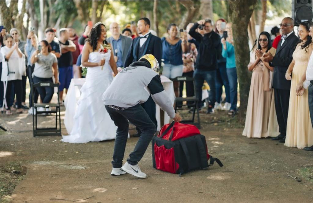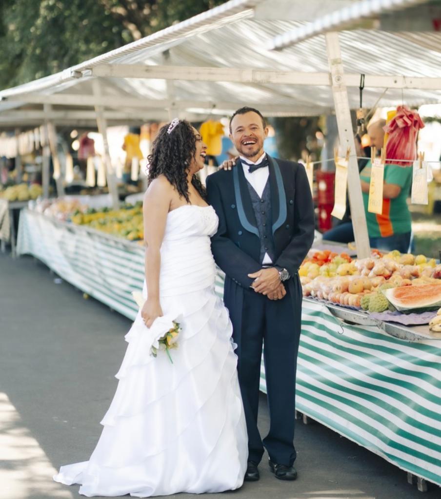 A cerimônia precisou acontecer no gramado ao lado da feira, para não atrapalhar as vendas dos feirantes. Além disso, de última hora, o casal decidiu que um sobrinho entregaria as alianças de moto, como delivery. “O povo de feira é tudo de bom, aquela vibração boa, energia, foi muito emocionante. Eu gostaria de casar de novo”.