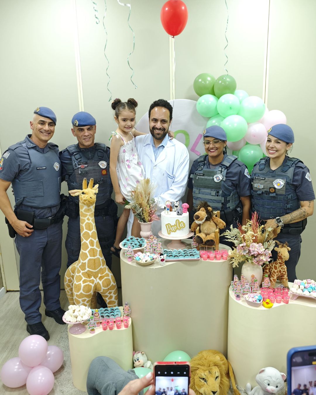 A celebração contou com bolo, presentes, música, duas amigas da aniversariante, toda a equipe do ambulatório e até dois policiais militares — um pedido especial de Paolla.