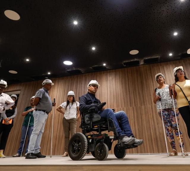 Membros do Conselho Municipal da Pessoa com Deficiência, Conselho Estadual para Assuntos da Pessoa com Deficiência, Assessoria de Políticas para o Idoso, Conselho Municipal de Direitos da Pessoa Idosa e Instituto Luiz Braille realizaram uma vistoria nas obras de revitalização do Centro das Artes para conferir a acessibilidade no local, na terça-feira (02). Os representantes aprovaram o projeto após uma visita pelos espaços, acompanhados do Gestor de Cultura, Marcelo Peroni.