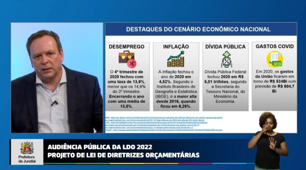 Parimoschi lembrou ainda que a construção da LDO é realista e, neste momento de investimentos contra a pandemia da Covid-19, um tanto conservadora. Durante a apresentação, o gestor compartilhou dados do Brasil, como números do PIB (Produto Interno Bruto), do desemprego, da inflação e de pesquisas que apontam o pessimismo das pessoas em relação ao momento atual. Sobre a cidade de Jundiaí, os números apresentados indicaram que, mesmo com a pandemia, a cidade segue em crescimento econômico.