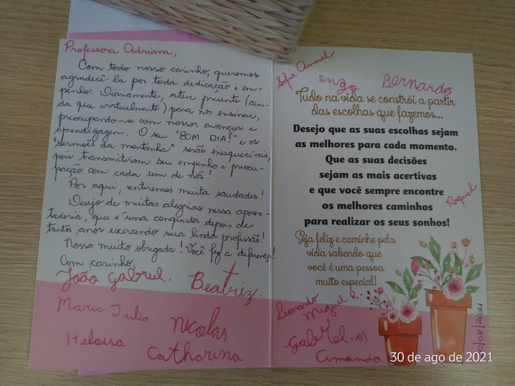 Os alunos entregaram um cartão, com frases de agradecimento por tudo o que a professora fez por eles. “Queremos agradecê-la por toda dedicação e empenho. O seu ‘bom dia’ e os ‘sermões da montanha’ serão inesquecíveis, pois transmitiram seu empenho e preocupação com cada um de nós”, registraram.
