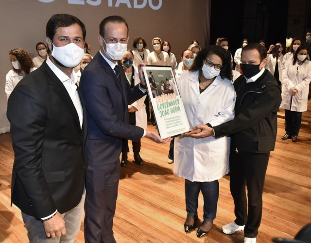 Doria recebeu uma placa com a foto da primeira vacina aplicada no Brasil, no braço da enfermeira Mônica Calazans, dia 17 de janeiro deste ano. O mimo foi entregue por Tiago Texera e também pela enfermeira Tatiane Dantas de Carvalho – primeira a receber a dose do imunizante no município.