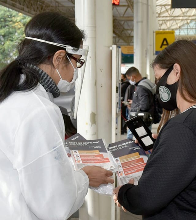 Como parte do plano, os profissionais passaram por todo o terminal entregando máscaras de pano, folhetos educativos e medindo a temperatura e o nível de oxigenação do sangue da população.