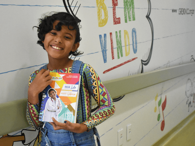 O rosto bonito e risonho que ilustra a capa da agenda 2020 do Grupo em Defesa da Criança com Câncer, o Grendacc, é de Maria Gabriela Bezerra e Silva, de 9 anos. Na fotografia tirada em 2018, Gabi, como é chamada pelos amigos, estava sem as madeixas, resultado do tratamento contra um linfoma de Hodgkin, tipo de câncer que acomete o sistema linfático.