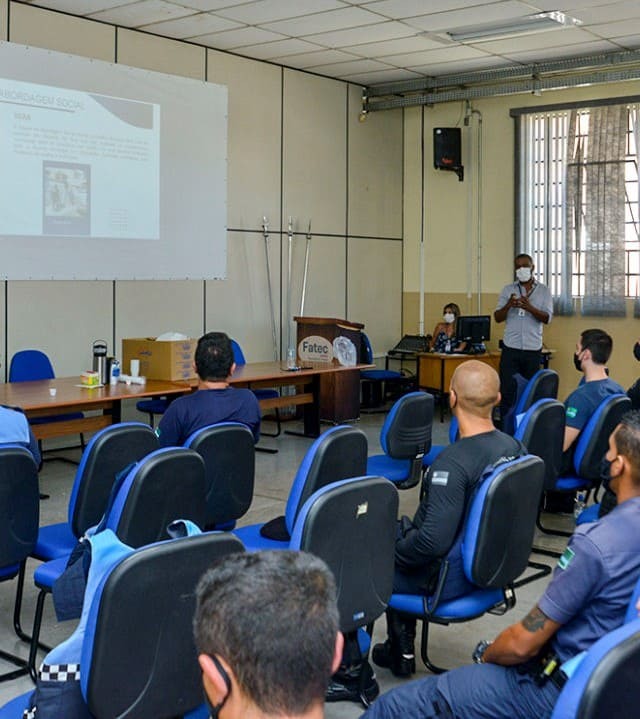 Os integrantes dos grupamentos operacionais da Guarda Municipal de Jundiaí (GMJ) participaram esta semana de encontros de formação com a Unidade de Gestão de Assistência e Desenvolvimento Social (UGADS) sobre a Rede Pop Rua, voltada para o atendimento de pessoas em situação de rua. As turmas, uma quarta (2) e outra da quinta (3), foram reunidas no auditório da Fatec, no Complexo Fepasa.