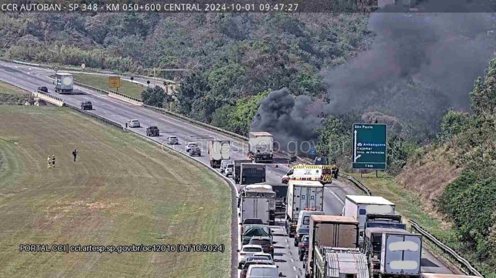 Nesta terça-feira (1º), por volta das 9h30, um caminhão pegou fogo no quilômetro 50 da Rodovia dos Bandeirantes (SP-348), em Jundiaí (SP). A faixa 1 está liberada, mas as 2 e 3 seguem interditadas.