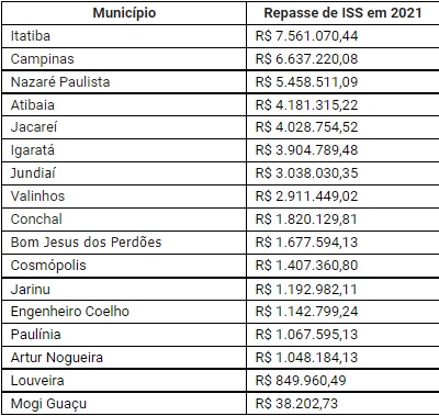Já Campinas recebeu R$ 7,5 milhões ao longo do ano, aumento de 41% em relação ao repasse de 2020, quando R$ 5,3 milhões foram destinados a Itatiba. O imposto incide sobre a contratação de terceiros para a prestação de serviços nas vias, como a realização de obras, além das tarifas nas praças de pedágio. Cada cidade tem liberdade para destinar o valor a diferentes áreas, como Saúde e Educação, conforme a sua necessidade.
