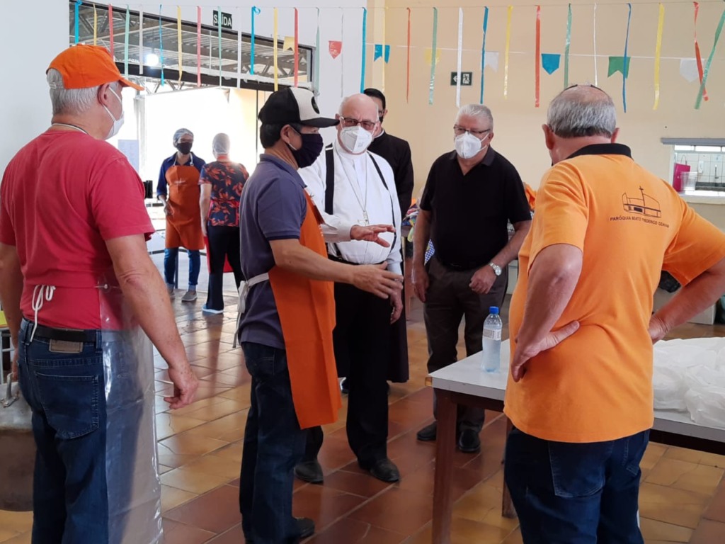 O bispo diocesano dom Vicente Costa esteve no evento e abençoou os voluntários e também os alimentos. Os kits davam direito às porções de arroz, tutu de feijão, porco e couve refogada – tudo em embalagens separadas.