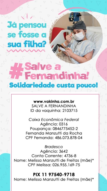 “Fernandinha sempre foi uma menina saudável, cheia de vida e com uma vontade imensa de viver e interagir com as pessoas. Porém, em dezembro de 2019, ela começou a sentir dores nas pernas, e como era muito ativa, fazia balé, jazz, natação e ainda participava do corpo de baile da escola onde dançava, a princípio, ninguém achou que pudesse ser alguma coisa mais grave. Depois de muitas dores e uma incessante visita à médicos e especialistas, em 17 de fevereiro do ano passado ela foi diagnosticada com Leucemia Linfóide Aguda (LLA), um câncer que atinge o sistema imunológico e medula óssea, uma doença agressiva e que não espera.”