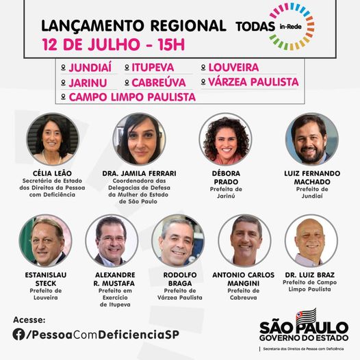 Nesta segunda-feira (12), a partir das 15h, a Secretaria dos Direitos da Pessoa com Deficiência de São Paulo lançará o programa TODAS in-Rede nos municípios de Cabreúva, Jundiaí, Campo Limpo Paulista, Itupeva, Jarinu, Louveira e Várzea Paulista.
