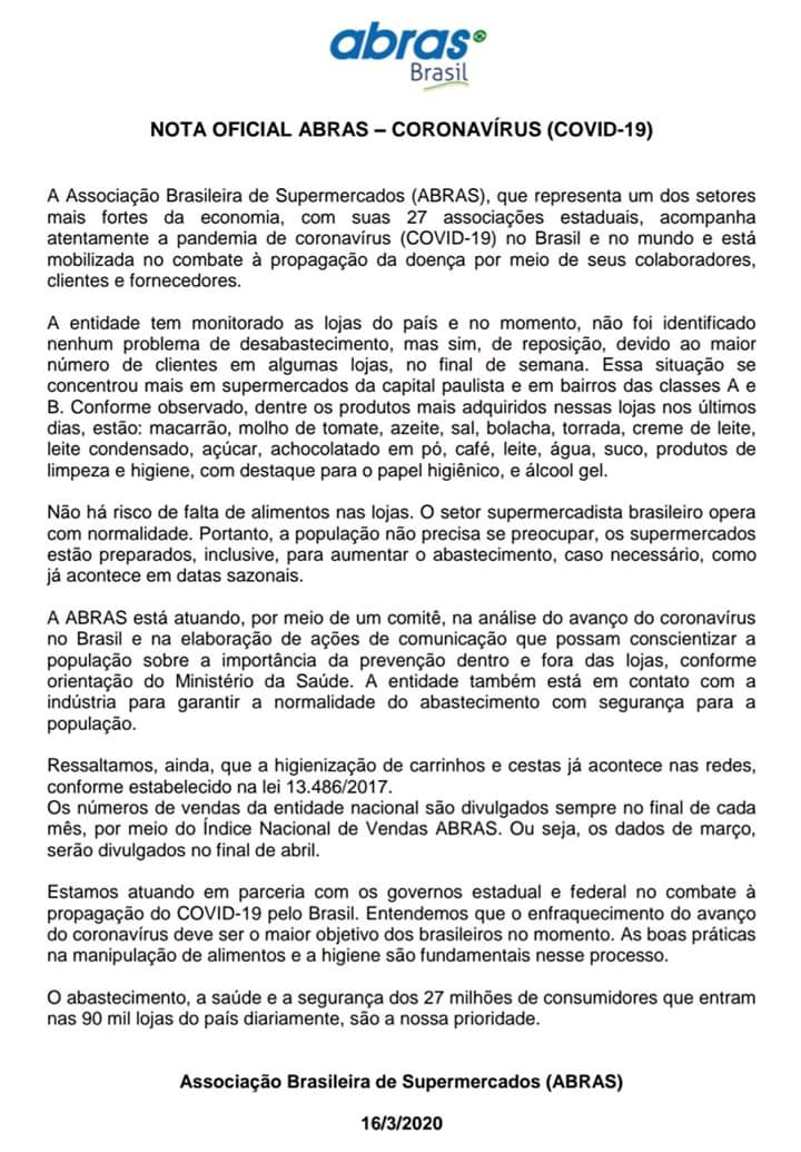 A Associação Brasileira de Supermercados (ABRAS) divulgou uma nota, na segunda-feira (16), para informar a população que não há risco de falta de alimento nas lojas de todo Brasil.
