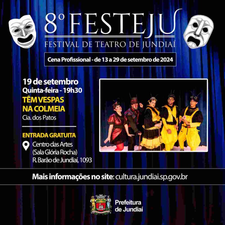 E além dessas, ele está em cartaz com a peça ‘Tem Vespas na Colmeia’, da Cia dos Patos. É uma peça infantil para toda a família que ocorre hoje (19), às 19h30, na Sala Glória Rocha, em Jundiaí. O projeto é uma iniciativa contemplada pela Lei Paulo Gustavo.