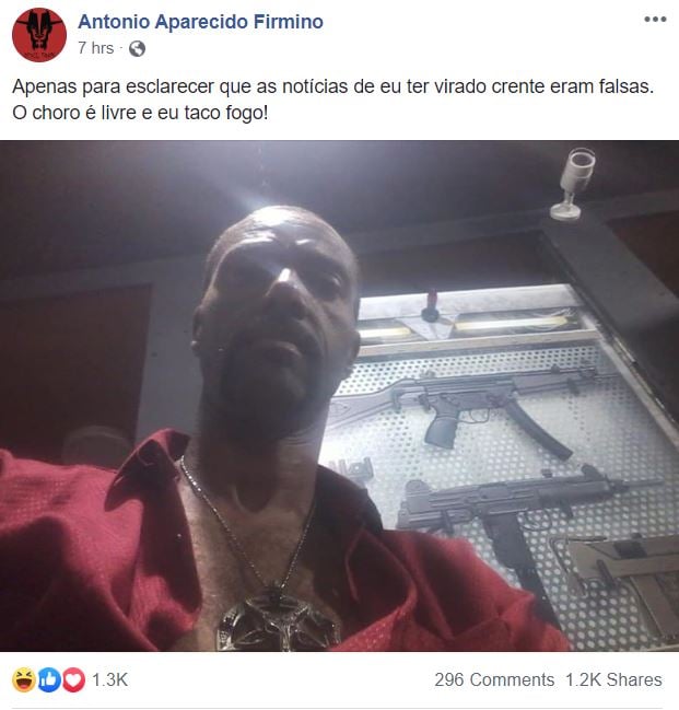 Nas redes sociais, ele desmentiu. “Apenas para esclarecer que as notícias sobre eu ter virado crente eram falsas. O choro é livre e eu taco fogo!”, escreveu.