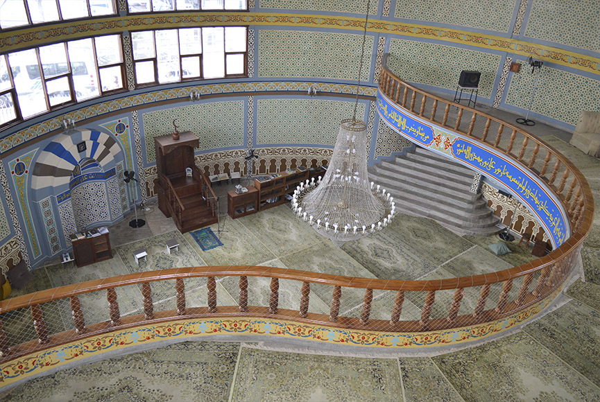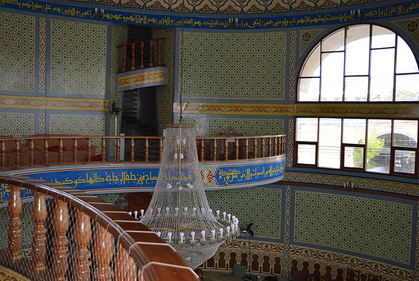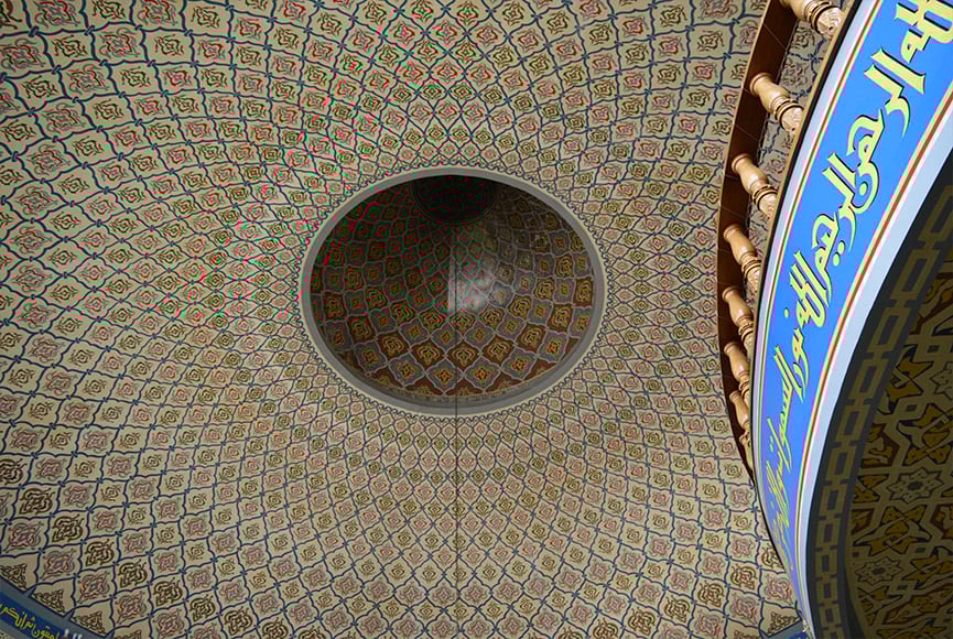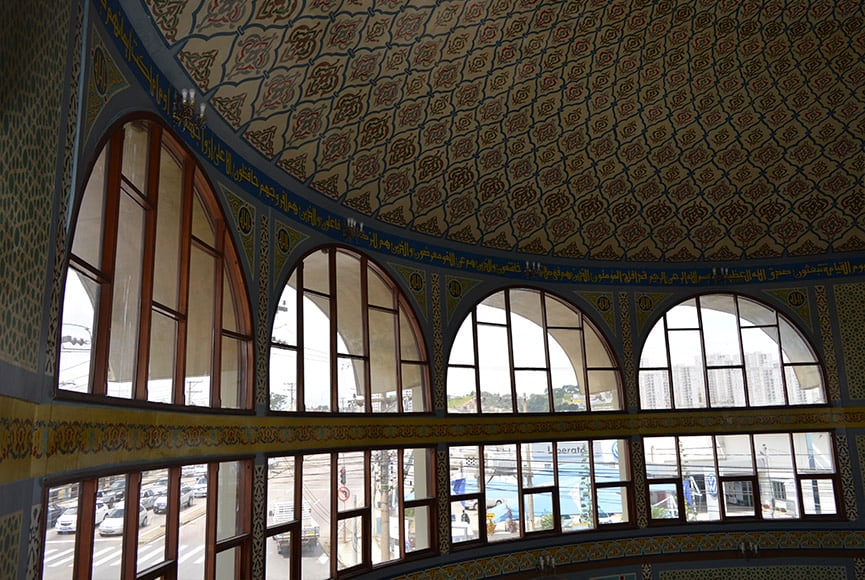 As pinturas, que tomam conta de toda a mesquita, da parede ao teto, foram feitas por um egípcio. Já ao redor de toda a abóbada, há escritos em árabe com Suratas, os capítulos do Alcorão, o livro sagrado dos muçulmanos.