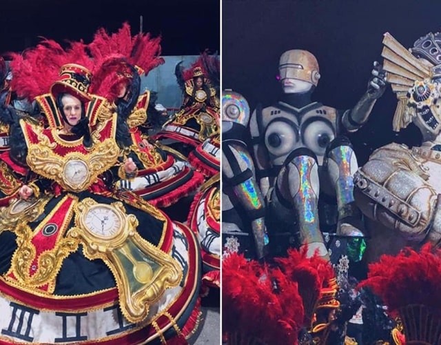 Com 300 integrantes e dois carros alegóricos, a escola apresentou o enredo: “A transformação do mundo através do tempo”.