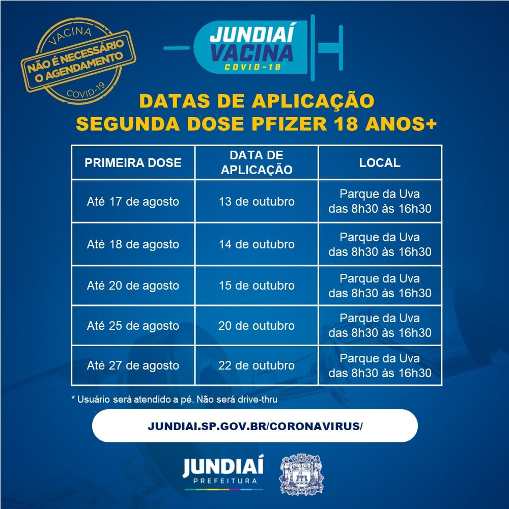 Com o novo prazo para a aplicação da segunda dose da vacina Pfizer estabelecido pelo Ministério da Saúde (MS), baixando de 12 semanas para 8 semanas, as pessoas devem ficar atentas ao calendário para não perder o prazo para a aplicação. Além do grupo que se encerra no próximo sábado (9), a aplicação a partir do dia 13, segue o cronograma abaixo, com atendimento das 8h30 às 16h30.