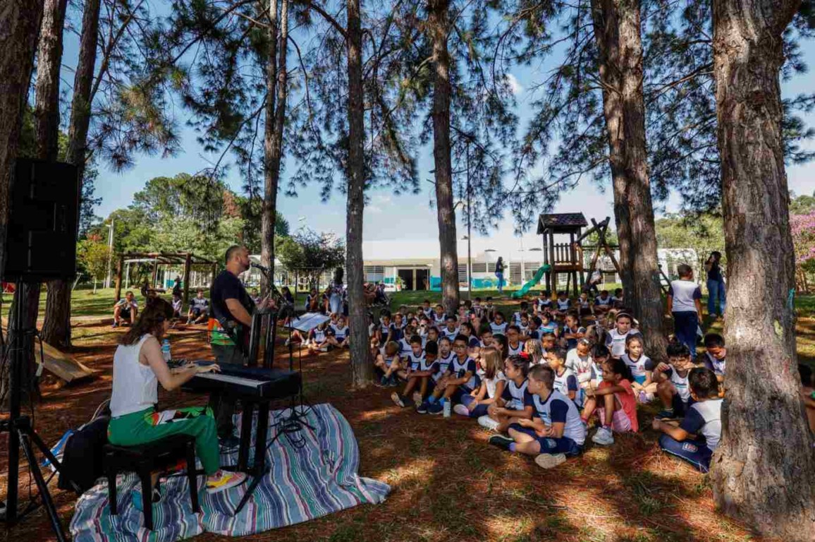 Logo pela manhã, a gestora de Educação, Vastí Ferrari Marques, acompanhou a programação na Emeb Professora Maria Angélica Lorençon, que passou por revitalização completa durante as férias escolares. Nos espaços externos, como o novo jardim sensorial e o parque naturalizado, as crianças dividiram-se em grupos para ouvir contações de histórias, fazer leitura de livros, desenvolver atividades de pintura e assistir à apresentação dos músicos Tom Nando e Cora Maria.
