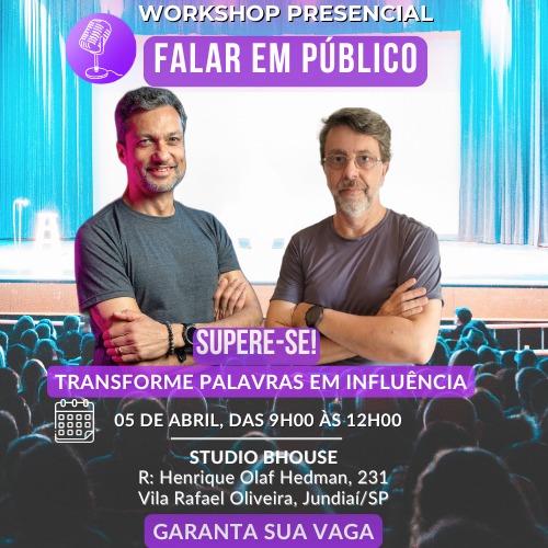 No dia 5 de abril, Carlos Cunha – publicitário, radialista, jornalista e especialista em oratória – e Carlos Henrique F. Alexandre – terapeuta e especialista em desenvolvimento humano, promoverão o Workshop “Falar em Público. Supere-se! Transforme Palavras em Influência”, em Jundiaí.