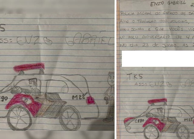 O pequeno enviou uma carta à corporação pedindo que policiais o visitassem nesta quinta-feira (23). Enzo completa 4 anos e, como presente de aniversário, quer conhecer verdadeiros policiais militares.