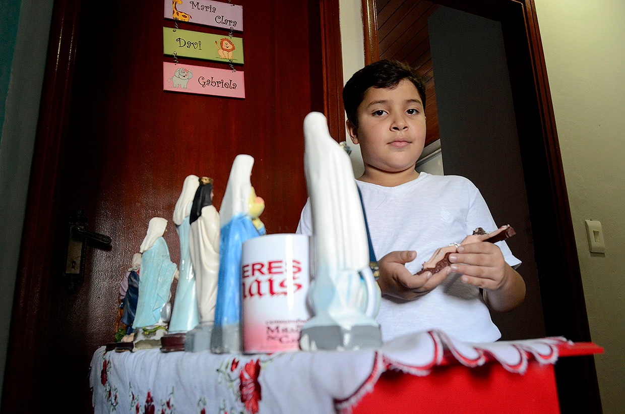 Se essa pergunta for feita para o Davi, é bem provável que a resposta dele seja: a imagem de algum santo. Thaís contou que no Dia das Crianças, ele pediu de presente dois santos que ele havia visto e ainda não tinha. E foi o presente que ele ganhou.