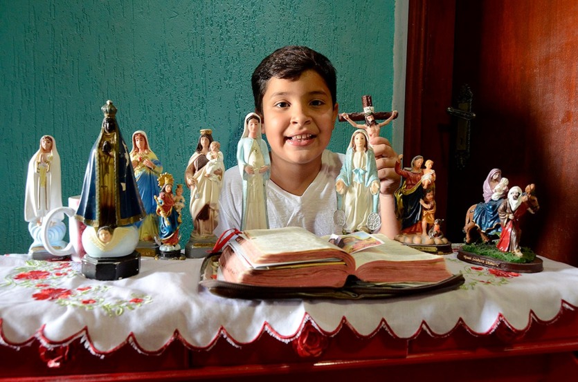 O garoto é um estudioso sobre a história dos santos e padroeiras.